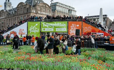De Nationale Tulpendag in Amsterdam; de gezellige en kleurrijke opening van het nieuwe tulpenseizoen. De opening van het tulpenseizoen wordt georganiseerd door Nederlandse tulpenkwekers. In een speciaal aangelegde pluktuin op de Dam kan iedereen gratis tulpen plukken. Met deze feestelijke actie barst het tulpenseizoen los waarin naar verwachting wereldwijd meer dan 1,7 miljard Hollandse tulpen het voorjaarsgevoel in huis zullen brengen.